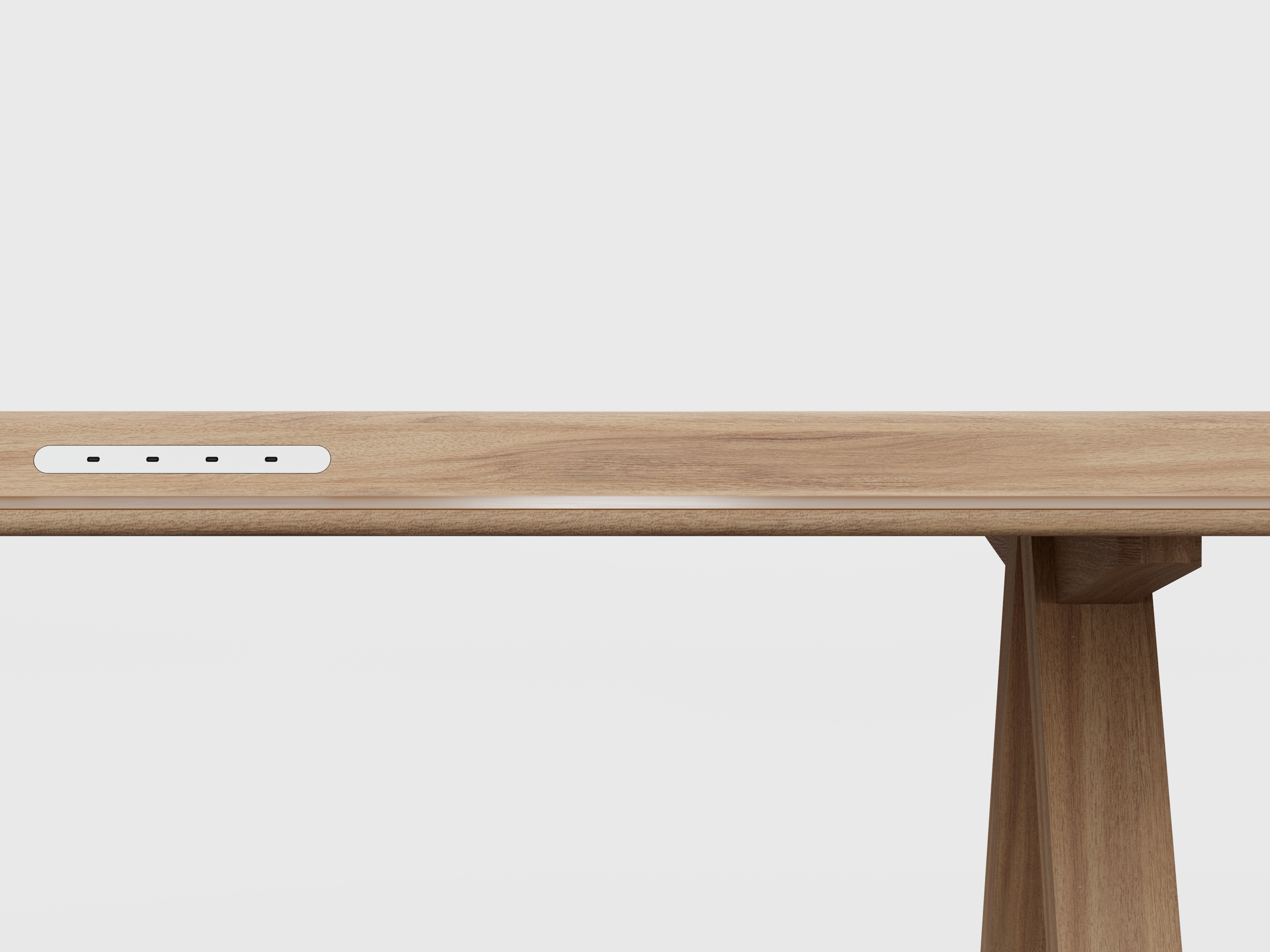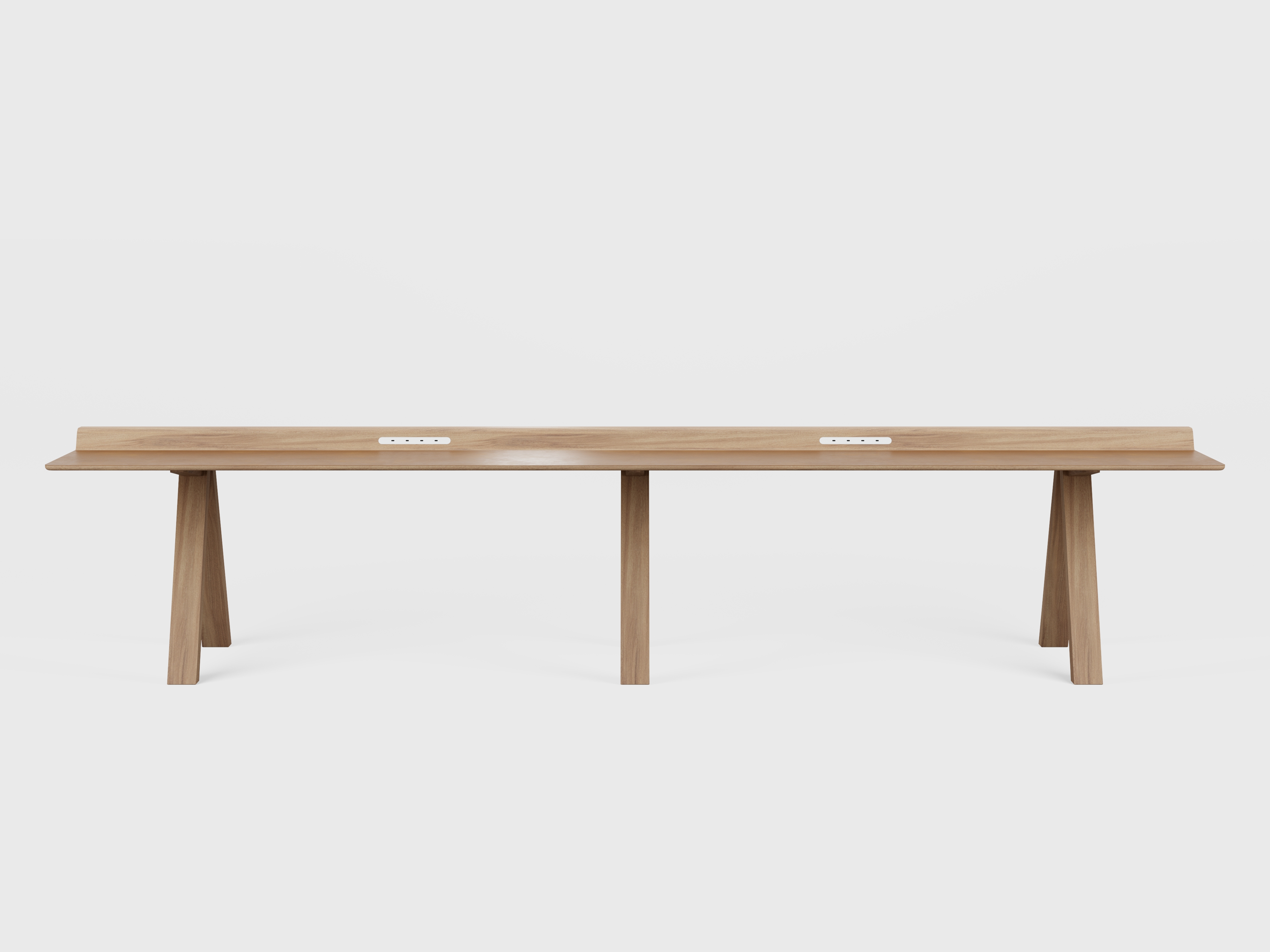 Beams typically found under the tabletop are moved above and centred to provide a sense of privacy for individual working, along with lateral bracing, small power, and structural support.